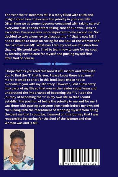 The Year the "I" Becomes ME is a story filled with truth and insight about how to become the priority in your own life. Often time we as women become consumed with taking care of everyone else's needs before taking care of our own. I was no exception. Everyone was more important to me except me. So I decided to take a journey to discover the "I" that is now ME. I had to decide to focus on caring for the Soul of the Woman and that Woman was ME. Whatever I fed my soul was the direction that my life would take. I had to learn how to care for my soul, by learning how to care for myself and putting myself first after God of course. I hope that as you read this book it will inspire and motivate you to find the "I" that is you. Please know there is so much more I wanted to share in this book but I chose not to overwhelm you with my life story. However, I did allow entry into parts of my life so that you as the reader could learn and understand the importance of becoming the "I". I took the journey of becoming the "I" in my own life so that I could establish the position of being the priority to me and for me. I was done with putting everyone else needs before my own and then living with the resentment of stopping myself from being the best me that I could be. I learned on this journey that I was responsible for caring for the Soul of the Woman and that Woman was and is ME.