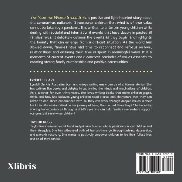 The Year the World Stood Still is positive and light-hearted story about the coronavirus outbreak. It reassures children that what is of true value cannot be taken by a pandemic. It is written to entertain young children while dealing with societal and international events that have deeply impacted all families' lives. It delicately outlines the events as they began and highlights the beauty that can emerge from a difficult situation. As the world has slowed down, families have had time to reconnect and refocus on love, relationships, and ensuring their time is spent in meaningful ways. It is a memento of current events and a concrete reminder of values essential to creating strong family relationships and positive communities.