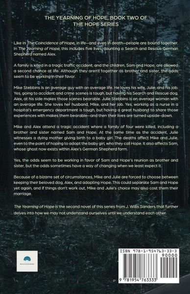 Like in The Coincidence of Hope, in life-and even in death-people are bound together. In The Yearning of Hope, this includes five lives, counting a Search and Rescue German Shepherd named Alex. A family is killed in a tragic traffic accident, and the children, Sam and Hope, are allowed a second chance at life. Although they aren't together as brother and sister, the odds seem to be working in their favor. Mike Stebbins is an average guy with an average life. He loves his wife, Julie, and his job. Yes, going to accident and crime scenes is tough, but having his Search and Rescue dog, Alex, at his side makes those scenes bearable. Julie Stebbins is an average woman with an average life. She loves her husband, Mike, and her job. Yes, working as a nurse in a hospital's emergency department is tough, but having a great husband to share those experiences with makes them bearable. And then their lives are turned upside-down. Mike and Alex attend a tragic accident where a family of four were killed, including a brother and sister named Sam and Hope. At the same time as the accident, Julie witnesses a dying mother giving birth to a baby girl. The deaths affect Mike and Julie, even to the point of hoping to adopt the baby girl, who they call Hope. It also affects Sam, whose ghost now exists within Alex's German Shepherd form. Yes, the odds seem to be working in favor of Sam and Hope's reunion as brother and sister, but the odds sometimes have a way of changing when we least expect it. Because of a bizarre set of circumstances, Mike and Julie are forced to choose between keeping their beloved dog, Alex, and adopting Hope. This could separate Sam and Hope yet again, and if things don't work out, Mike and Julie's choice may also cost them their marriage. The Yearning of Hope is the second novel of this series from J. Willis Sanders that further delves into how we may not understand ourselves until we understand each other.