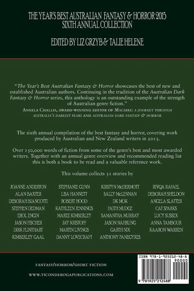 The sixth annual compilation of the best fantasy and horror, covering work produced by Australian and New Zealand writers in 2015. Over 150,000 words of fiction from some of the genre's best and most awarded writers. Together with an annual genre overview and recommended reading list this is both a book to be read and a valuable reference work. This volume collects 31 stories by Joanne Anderton, Alan Baxter, Deborah Biancotti, Stephen Dedman, Erol Engin, Jason Fischer, Dirk Flinthart, Kim Gaal, Stephanie Gunn, Lisa Hannett, Robert Hood, Kathleen Jennings, Maree Kimberley, Jay Kristoff, Martin Livings, Danny Lovecraft, Kirstyn McDermott, Sally McLennan, DK Mok, Faith Mudge, Samantha Murray, Jason Nahrung, Garth Nix, Anthony Panegyres, Rivqa Rafael, Deborah Sheldon, Angela Slatter, Cat Sparks, Lucy Sussex, Anna Tambour, Kaaron Warren. Award-winning series.