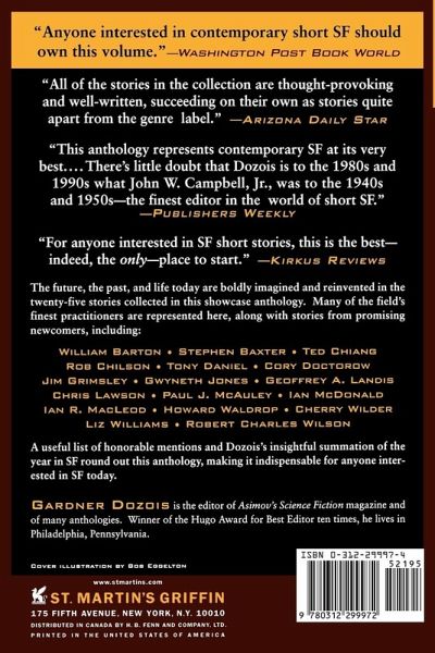 The past through tomorrow are boldly imagined and reinvented in the twenty-five stories collected in this showcase anthology. Many of the field's finest practitioners are represented here, along with stories from promising newcomers, including: William Barton * Rob Chilson * Tony Daniel * Cory Doctorow * Jim Grimsley * Gwyneth Jones * Chris Lawson * Ian McDonald * Robert Reed * William Browning Spencer * Allen Steele * Michael Swanwick * Howard Waldrop * Cherry Wilder * Liz Williams A useful list of honorable mentions and Dozois's insightful summation of the year in sf round out this anthology, making it indispensable for anyone interested in SF today.