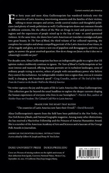 For forty years and more Alma Guillermoprieto has wandered tirelessly over the countries of Latin America, interviewing assassins and the families of their victims, talking to street sweepers and artists, rowdy carnival makers and thoughtful politicians (and plenty of rowdy politicians as well). Guillermoprieto draws out common threads in different contexts, like the effects of The War on Drugs in rural and poverty-stricken regions and the experiences of people mixed up in the fray of state- or cartel-sponsored violence. At the same time, she shows how Latin American art translates nostalgia and pain into great beauty. In The Years of Blood, the third volume of her collected reporting, she completes her complex and always compelling portrait of the Latin America of our times, in all its tragedy and glory, as it enters a new era of populism and demagoguery, and tries, yet again, to answer the great unsolved question: How do we change our future so that it does not so exhaustingly resemble our past?