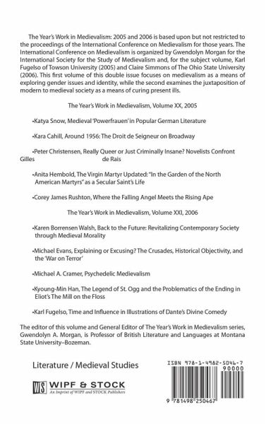 The Year's Work in Medievalism:2005-2006 is based upon but not restricted to the proceedings of the International Conference on Medievalism for those years. The International Conference on Medievalism is organized by Gwendolyn Morgan for the International Society for the Study of Medievalism and, for the subject volume, Karl Fugelso of Towson University (2005) and Claire Simmons of Ohio State University (2006). This first volume of this double issue focuses on medievalism as a means of exploring gender issues and identity,while the second examines the juxtaposition of modern to medieval society as a means of curing present ills.