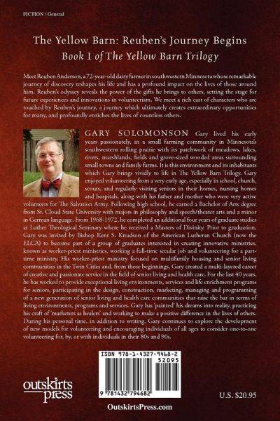The Yellow Barn: Reuben's Journey Begins Book I of The Yellow Barn Trilogy Meet Reuben Anderson, a 72-year-old dairy farmer in southwestern Minnesota whose remarkable journey of discovery reshapes his life and has a profound impact on the lives of those around him. Reuben's odyssey reveals the power of the gifts he brings to others, setting the stage for future experiences and innovations in volunteerism. We meet a rich cast of characters who are touched by Reuben's journey, a journey which ultimately creates extraordinary opportunities for many, and profoundly enriches the lives of countless others. Gary Solomonson Gary's early years were lived passionately in a small farming community in Minnesota's southwestern rolling prairie with its patchwork of meadows, lakes, rivers, marshlands, fields and grove-sized wooded areas surrounding small towns and family farms. It is this environment and its inhabitants which Gary brings vividly to life in The Yellow Barn Trilogy. Gary enjoyed volunteering from a very early age, especially in school, church, scouts, and regularly visiting seniors in their homes, nursing homes and hospitals, along with his father and mother who were very active volunteers for The Salvation Army. Following high school, he earned a Bachelor of Arts degree from St. Cloud State University with majors in philosophy and speech/theater arts and a minor in German language. From 1968-1972, he completed an additional four years of graduate studies at Luther Theological Seminary where he received a Masters of Divinity. Prior to graduation, Gary was invited by Bishop Kent S. Knudson of the American Lutheran Church (now the ELCA) to become part of a group of graduates interested in creating innovative ministries, known as worker-priest ministries, working a full-time secular job and volunteering for a part-time ministry. His worker-priest ministry focused on multifamily housing and senior living communities i
