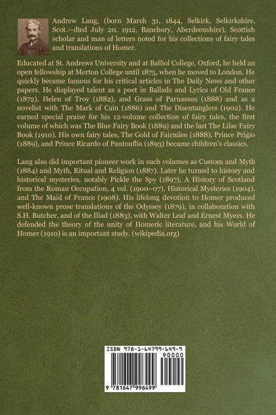 Andrew Lang, (born March 31, 1844, Selkirk, Selkirkshire, Scot.-died July 20, 1912, Banchory, Aberdeenshire), Scottish scholar and man of letters noted for his collections of fairy tales and translations of Homer. Educated at St. Andrews University and at Balliol College, Oxford, he held an open fellowship at Merton College until 1875, when he moved to London. He quickly became famous for his critical articles in The Daily News and other papers. He displayed talent as a poet in Ballads and Lyrics of Old France (1872), Helen of Troy (1882), and Grass of Parnassus (1888) and as a novelist with The Mark of Cain (1886) and The Disentanglers (1902). He earned special praise for his 12-volume collection of fairy tales, the first volume of which was The Blue Fairy Book (1889) and the last The Lilac Fairy Book (1910). His own fairy tales, The Gold of Fairnilee (1888), Prince Prigio (1889), and Prince Ricardo of Pantouflia (1893) became children's classics. Lang also did important pioneer work in such volumes as Custom and Myth (1884) and Myth, Ritual and Religion (1887). Later he turned to history and historical mysteries, notably Pickle the Spy (1897), A History of Scotland from the Roman Occupation, 4 vol. (1900-07), Historical Mysteries (1904), and The Maid of France (1908). His lifelong devotion to Homer produced well-known prose translations of the Odyssey (1879), in collaboration with S.H. Butcher, and of the Iliad (1883), with Walter Leaf and Ernest Myers. He defended the theory of the unity of Homeric literature, and his World of Homer (1910) is an important study. (wikipedia.org)