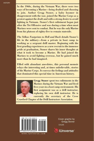In the 1960s, during the Vietnam War, there were two ways of becoming a Marine-being drafted and choosing to join. Author Gregg Stoner, a baby boomer in disagreement with the war, joined the Marine Corps as a protest against the draft and with a strong desire to avoid fighting in Vietnam. Stoner's first enlistment began just after the Tet Offensive and was during a time when most Marines were sent to combat. But he was the only soldier from his platoon of eighty-five to remain stateside. The Yellow Footprints to Hell and Back details Stoner's life in the military-from a private in boot camp to working as a sergeant drill master. Beginning with the first grueling experiences as a new recruit to the immense pride at graduation, Stoner shares his inner thoughts at what it took to become a Marine. He had joined the Marines to avoid fighting overseas, but he gained much more than he had imagined. Filled with abundant anecdotes, this personal memoir relays the interesting and, at times unbelievable, stories of the Marine Corps. It conveys the feelings and attitudes that dominated this special time in American history.