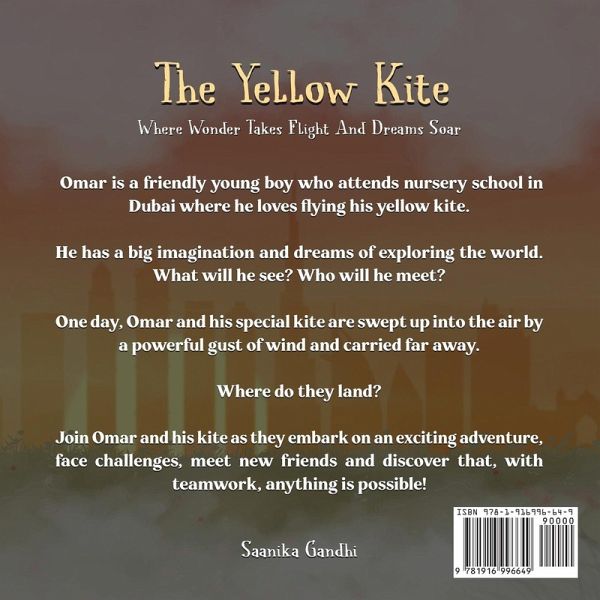 In a world filled with wonder and boundless possibilities, The Yellow Kite takes young readers on a magical adventure that explores the power of friendship, courage, and dreams. Omar who attends a nursery school in Dubai loves nothing more than fling his yellow kite. The kite isn't just an ordinary kite; it's a beacon of adventure, friendship, and the courage to soar above life's challenges. As Omar and his kite set off on a great adventure, he also learns valuable lessons about kindness and teamwork. This beautifully illustrated children's book, crafted by early childhood education expert and author Saanika Gandhi, is perfect for young readers aged 2 to 5. Filled with vibrant illustrations and heartfelt storytelling, The Yellow Kite encourages children to embrace their imagination, think creatively, and find the courage to fly high no matter what obstacles they face. Perfect for bedtime stories, classroom reads, or family bonding, The Yellow Kite will inspire children and parents alike to dream big and cherish the magic of friendship.
