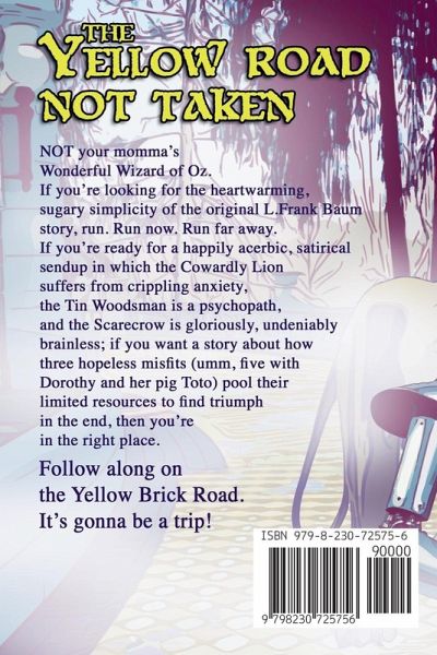 The Yellow Road Not Taken is NOT your momma's Wonderful Wizard of Oz. If you're looking for the heartwarming, sugary simplicity of the original L.Frank Baum story, run. Run now. Run far away. If you're ready for a happily acerbic, satirical sendup in which the Cowardly Lion suffers from crippling anxiety, the Tin Woodsman is a psychopath, and the Scarecrow is gloriously, undeniably brainless, then you're in the right place. If you want a story about how three hopeless misfits (umm, wait, five with Dorothy and her pig Toto). Anyway, if you want to see how they pool their limited resources to find triumph in the end, then you're in for a treat you won't soon forget. Throw away your pre-conceptions. Fall into the vortex of a tornado's worth of twists and turns. Dive into a revered, almost universal story that wowed readers long before the MGM movie of the 1930s. You think you know this story. You think you can almost recite it from memory. But I guarantee this tale of growth, redemption, and found family will take you places you never imagined. And you absolutely, positively do not know how it ends. Follow along on the Yellow Brick Road. It's gonna be a trip!