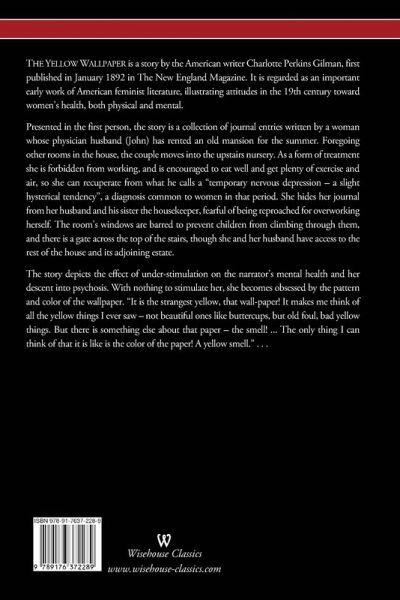 THE YELLOW WALLPAPER is a story by the American writer Charlotte Perkins Gilman, first published in January 1892 in The New England Magazine. It is regarded as an important early work of American feminist literature, illustrating attitudes in the 19th century toward women's health, both physical and mental. Presented in the first person, the story is a collection of journal entries written by a woman whose physician husband (John) has rented an old mansion for the summer. Foregoing other rooms in the house, the couple moves into the upstairs nursery. As a form of treatment she is forbidden from working, and is encouraged to eat well and get plenty of exercise and air, so she can recuperate from what he calls a "temporary nervous depression - a slight hysterical tendency", a diagnosis common to women in that period. She hides her journal from her husband and his sister the housekeeper, fearful of being reproached for overworking herself. The room's windows are barred to prevent children from climbing through them, and there is a gate across the top of the stairs, though she and her husband have access to the rest of the house and its adjoining estate. The story depicts the effect of under-stimulation on the narrator's mental health and her descent into psychosis. With nothing to stimulate her, she becomes obsessed by the pattern and color of the wallpaper. "It is the strangest yellow, that wall-paper! It makes me think of all the yellow things I ever saw - not beautiful ones like buttercups, but old foul, bad yellow things. But there is something else about that paper - the smell! ... The only thing I can think of that it is like is the color of the paper! A yellow smell." . . . (more on www.wsiehouse-classics.com)