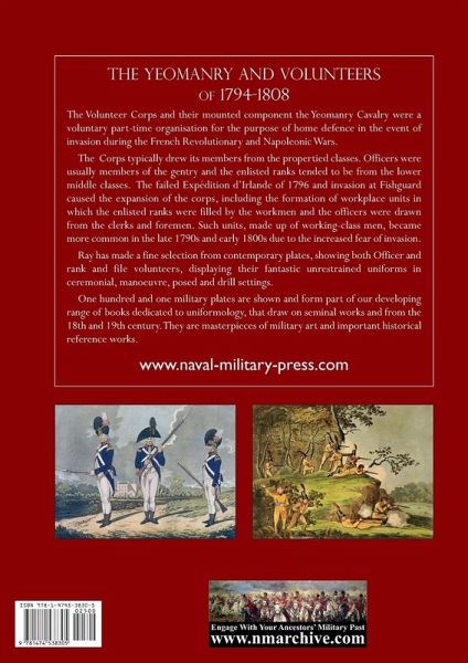 The Volunteer Corps and their mounted component the Yeomanry Cavalry were a voluntary part-time organisation for the purpose of home defence in the event of invasion, during the French Revolutionary and Napoleonic Wars. The Corps typically drew its members from the propertied classes. Officers were usually members of the gentry and the enlisted ranks tended to be from the lower middle classes. The failed Expédition d'Irlande of 1796 and invasion at Fishguard caused the expansion of the corps, including the formation of workplace units in which the enlisted ranks were filled by the workmen and the officers were drawn from the clerks and foremen. Such units, made up of working-class men, became more common in the late 1790s and early 1800s due to the increased fear of invasion. Ray has made a fine selection from contemporary plates, showing both Officer and rank and file volunteers, displaying their fantastic unrestrained uniforms in ceremonial, manoeuvre, posed and drill settings. One hundred and one military plates are shown and form part of our developing range of books dedicated to uniformology, that draw on seminal works and from the 18th and 19th century. They are masterpieces of military art, and important historical reference works.