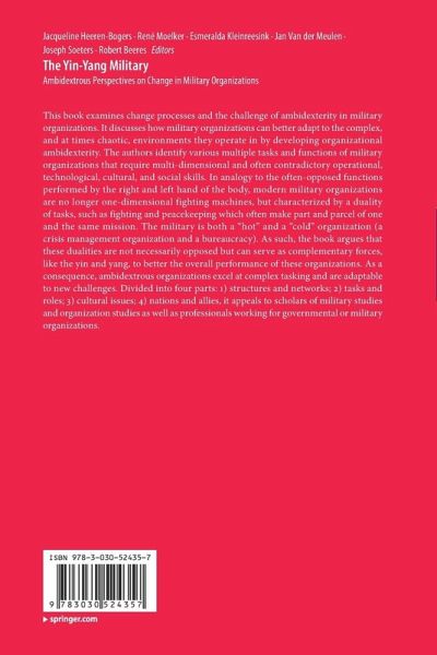 This book examines change processes and the challenge of ambidexterity in military organizations. It discusses how military organizations can better adapt to the complex, and at times chaotic, environments they operate in by developing organizational ambidexterity. The authors identify various multiple tasks and functions of military organizations that require multi-dimensional and often contradictory operational, technological, cultural, and social skills. In analogy to the often-opposed functions performed by the right and left hand of the body, modern military organizations are no longer one-dimensional fighting machines, but characterized by a duality of tasks, such as fighting and peacekeeping which often make part and parcel of one and the same mission. The military is both a "hot" and a "cold" organization (a crisis management organization and a bureaucracy). As such, the book argues that these dualities are not necessarily opposed but can serve as complementary forces, likethe yin and yang, to better the overall performance of these organizations. As a consequence, ambidextrous organizations excel at complex tasking and are adaptable to new challenges. Divided into four parts: 1) structures and networks; 2) cultural issues; 3) tasks and roles; 4) nations and allies, it appeals to scholars of military studies and organization studies as well as professionals working for governmental or military organizations.