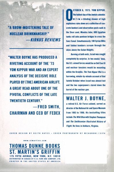 Walter J. Boyne's The Yom Kippur War is a spellbinding chronicle of the international chess game that was played out in October 1973. It is a story of diplomacy and military might that accounts for many of the dilemmas faced in the present-day Middle East. It's usually called the Yom Kippur War. Or sometimes the October War. The players that surround it are familiar: Sadat and Mubarak, Meir and Sharon, Nixon and Kissinger, Brezhnev and Dobyrnin. It was a war that brought Arab and Jew into vicious conflict. A war in which Israel almost unleashed her nuclear arsenal and set two superpowers on a treacherous course of nuclear escalation. And a war that eventually brought peace. But a peace fraught with delicate tensions, disputed borders, and a legacy of further bloodshed. This is a war that Israel never thought was possible. Surprised by the fury and excellent execution of the Arab onslaught, and perhaps more than a little complacent, Israel suddenly found itself on the point of losing a war because of a lack of ammunition, planes and tanks. The United States, after much vacillation, finally elected to help Israel, beginning a tremendous airlift (code name: Operation Nickel Grass) which incurred the wrath of the Arab states, and their sponsor, the Soviet Union. Fortunately, the airlift came just in time for Israeli ground forces to stabilize their positions and eventually turn the tide in the Sinai and Golan Heights. And it was all made possible by an operation that dwarfed the Berlin Airlift and the Soviets' simultaneous efforts in Egypt and Syria. The Yom Kippur War is bound to become the definitive history of a war that quite literally approached Armageddon.