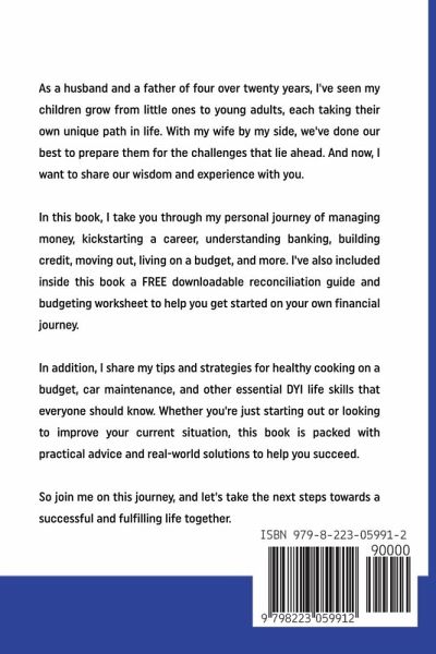 Congratulations! So, you're all grown up and ready to spread your wings and leave the nest. But what's next? How much will it cost? How do you build a career that will support you and one day a family of your own? As you have gotten older, you're now taking on more responsibilities, and it will be 100% up to you to accomplish them all. There are many life skills that are NOT being taught in school! Do not worry; with or without a starting budget, you can do this! The good news is with this book you'll be able to avoid many pitfalls and start with a strong foundation of knowledge to build on. Here's what's coming towards you very quickly... You're going to have to build a career, build resumes, have successful interviews, transition all your bills from your parents to your name, have your own bank accounts, start budgeting and planning for your future, build a home for yourself, maintain your vehicle and so much more Don't panic - you're in the right place. This book will share with you life lessons, tips & strategies to make your launch from your parent's home smooth, successful, and stress-free. In this Adult's Survival Guide you'll discover: ¿ How to manage your money, reconcile bank accounts and build budgets. Included is a FREE downloadable pre-built reconciliation/budgeting worksheet. ¿ Kickstarting your career from resume building to successful interviewing to land the job. ¿ Banking 101, the basics of understanding banking and what you'll need. ¿ How to build and grow your credit. ¿ Essentials on moving out guide, transitioning from your family's home to your own home. ¿ Tips and strategies on how to live on a small budget, DIY recipes ¿ Healthy cooking and food skills, easy meal plans, and recipe ideas ¿ Car skills everyone should know, tire care, jumpstarting a car, oil, and air filters even if you're not a mechanic. With this book, you'll be able to look forward to being a successful and happy adult. So scroll up and grab a copy today. This is an awesome high school graduation gift, especially with the downloadable pre-built reconciliation and budgeting worksheets. The book is also the perfect high school graduation, new job, and college gift. It's packed full of adulting life hacks to help your child, grandchild, niece, nephew, or friend succeed in the world.