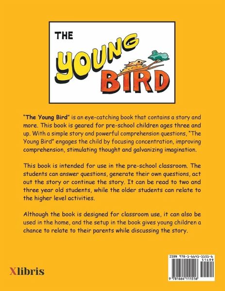"The Young Bird" is an eye-catching book that contains a story and more. This book is geared for pre-school children ages three and up. With a simple story and powerful comprehension questions, "The Young Bird" engages the child by focusing concentration, improving comprehension, stimulating thought and galvanizing imagination. This book is intended for use in the pre-school classroom. The students can answer questions, generate their own questions, act out the story or continue the story. It can be read to two and three year old students, while the older students can relate to the higher level activities. Although the book is designed for classroom use, it can also be used in the home, and the setup in the book gives young children a chance to relate to their parents while discussing the story.