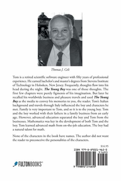 Tom is a retired scientific software engineer with fifty years of professional experience. He earned bachelor's and master's degrees from Stevens Institute of Technology in Hoboken, New Jersey. Frequently, thoughts flow into his head during the night. The Young Boy was one of those thoughts. The first few chapters were purely figments of his imagination. But later he recalled his worldwide business and pleasure travels and used The Young Boy as the media to convey his memories to you, the reader. Tom's Italian background and travels through Italy influenced the boy and characters he met. Family is very important to Tom, and so it is to the young boy. Tom and the boy worked with their fathers in a family business from an early age. However, advanced education separated the boy and Tom from the businesses. Mathematics was key in the development of both Tom and the boy. Tom learned advanced math from on-the-job education. The boy had a natural talent for math. None of the characters in the book have names. The author did not want the reader to preconceive the personalities of the characters.