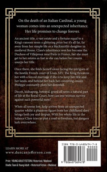 On the death of an Italian Cardinal, a young woman comes into an unexpected yet fabulous inheritance and her life promises to change forever. An ancient title, a vast estate and a fortune equal to a King's ransom seem a glittering prize but it's all far, far away from her simple life as a blacksmith's daughter in medieval Rome. Clare's inheritance sees her become the Duchess of Villeprieux near Paris in France, but she must get to her estates as fast as she can before her cousin usurps her title. Once there, she finds herself alone facing the intrigues of the hostile French court of Louis XIV. The King threatens her with a forced marriage if she is to keep her title and her lands, and behind her back her conniving cousin Philippe constantly plots her downfall. Deceit, kidnaping, betrayal, greed all seem a natural part of life at the Royal Court, how can one woman survive against such powerful men? When all seems lost, help arrives from an unexpected quarter whilst a phantom figure from her childhood days brings both joy and despair. With her whole life in the balance Clare tries to plot a road to freedom, but dangers lurks everywhere.