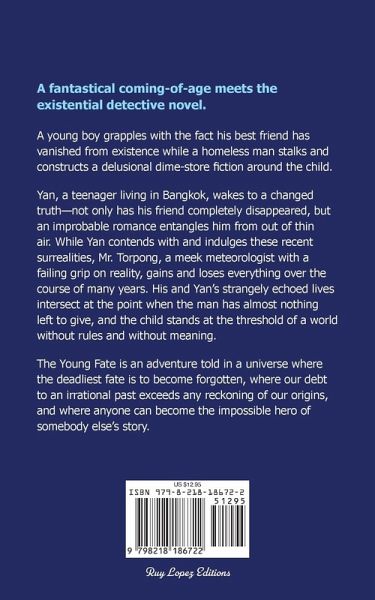 A fantastical coming-of-age meets the existential detective novel. A young boy grapples with the fact his best friend has vanished from existence while a homeless man stalks and constructs a delusional dime-store fiction around the child. Yan, a teenager living in Bangkok, wakes to a changed truth-not only has his friend completely disappeared, but an improbable romance entangles him from out of thin air. While Yan contends with and indulges these recent surrealities, Mr. Torpong, a meek meteorologist with a failing grip on reality, gains and loses everything over the course of many years. His and Yan's strangely echoed lives intersect at the point when the man has almost nothing left to give, and the child stands at the threshold of a world without rules and without meaning. The Young Fate is an adventure told in a universe where the deadliest fate is to become forgotten, where our debt to an irrational past exceeds any reckoning of our origins, and where anyone can become the impossible hero of somebody else's story.