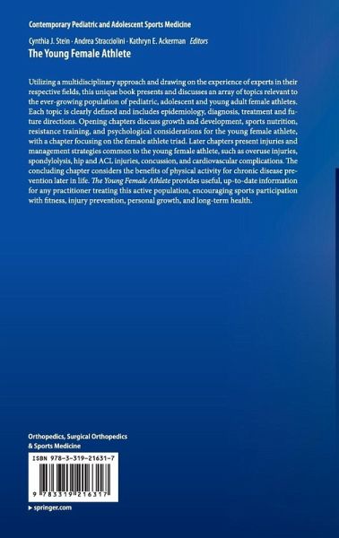 1.Growth and Development.- 2.Sports Nutrition.- 3.Resistance Training.- 4.Mental Skills Training.- 5.The Female Athlete Triad.- 6.Overuse Injuries.- 7.Spondylolysis.- 8.Hip Injuries.- 9.ACL Injuries.- 10.Concussion in Sports.- 11.Management of Cardiovascular Concerns.- 12.Physical Activity and Chronic Disease Prevention.