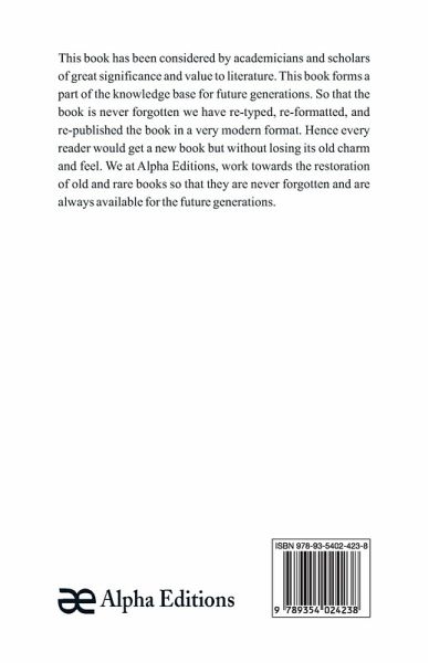 This book has been considered by academicians and scholars of great significance and value to literature. This book forms a part of the knowledge base for future generations. So that the book is never forgotten we have re-typed, re-formatted, and re-published the book in a very modern format. Hence every reader would get a new book but without losing its old charm and feel. We at Alpha Editions, work towards the restoration of old and rare books so that they are never forgotten and are always available for the future generations.