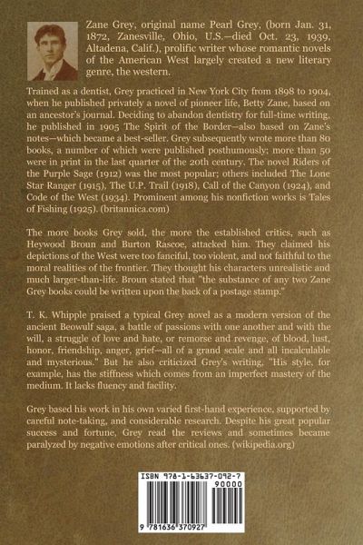 Zane Grey, original name Pearl Grey, (born Jan. 31, 1872, Zanesville, Ohio, U.S.—died Oct. 23, 1939, Altadena, Calif.), prolific writer whose romantic novels of the American West largely created a new literary genre, the western. Trained as a dentist, Grey practiced in New York City from 1898 to 1904, when he published privately a novel of pioneer life, Betty Zane, based on an ancestor’s journal. Deciding to abandon dentistry for full-time writing, he published in 1905 The Spirit of the Border—also based on Zane’s notes—which became a best-seller. Grey subsequently wrote more than 80 books, a number of which were published posthumously; more than 50 were in print in the last quarter of the 20th century. The novel Riders of the Purple Sage (1912) was the most popular; others included The Lone Star Ranger (1915), The U.P. Trail (1918), Call of the Canyon (1924), and Code of the West (1934). Prominent among his nonfiction works is Tales of Fishing (1925). (britannica.com) The more books Grey sold, the more the established critics, such as Heywood Broun and Burton Rascoe, attacked him. They claimed his depictions of the West were too fanciful, too violent, and not faithful to the moral realities of the frontier. They thought his characters unrealistic and much larger-than-life. Broun stated that "the substance of any two Zane Grey books could be written upon the back of a postage stamp." T. K. Whipple praised a typical Grey novel as a modern version of the ancient Beowulf saga, a battle of passions with one another and with the will, a struggle of love and hate, or remorse and revenge, of blood, lust, honor, friendship, anger, grief—all of a grand scale and all incalculable and mysterious." But he also criticized Grey's writing, "His style, for example, has the stiffness which comes from an imperfect mastery of the medium. It lacks fluency and facility. Grey based his work in his own varied first-hand experience, supported by careful note-taking, and considerable research. Despite his great popular success and fortune, Grey read the reviews and sometimes became paralyzed by negative emotions after critical ones. (wikipedia.org)