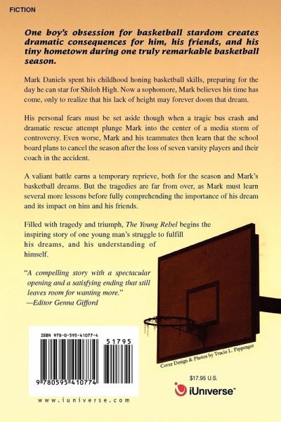 One boy's obsession for basketball stardom creates dramatic consequences for him, his friends, and his tiny hometown during one truly remarkable basketball season. Mark Daniels spent his childhood honing basketball skills, preparing for the day he can star for Shiloh High. Now a sophomore, Mark believes his time has come, only to realize that his lack of height may forever doom that dream. His personal fears must be set aside though when a tragic bus crash and dramatic rescue attempt plunge Mark into the center of a media storm of controversy. Even worse, Mark and his teammates then learn that the school board plans to cancel the season after the loss of seven varsity players and their coach in the accident. A valiant battle earns a temporary reprieve, both for the season and Mark's basketball dreams. But the tragedies are far from over, as Mark must learn several more lessons before fully comprehending the importance of his dream and its impact on him and his friends. Filled with tragedy and triumph, The Young Rebel begins the inspiring story of one young man's struggle to fulfill his dreams, and his understanding of himself. "A compelling story with a spectacular opening and a satisfying ending that still leaves room for wanting more." - Editor Genna Gifford