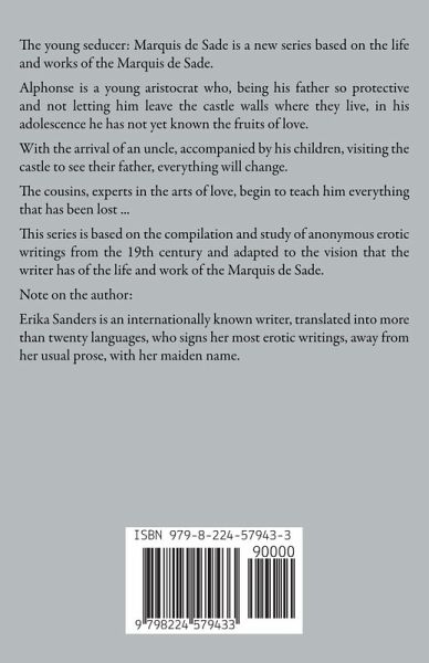 The young seducer: Marquis de Sade is a new series based on the life and works of the Marquis de Sade. Alphonse is a young aristocrat who, being his father so protective and not letting him leave the castle walls where they live, in his adolescence he has not yet known the fruits of love. With the arrival of an uncle, accompanied by his children, visiting the castle to see their father, everything will change. The cousins, experts in the arts of love, begin to teach him everything that has been lost ... This series is based on the compilation and study of anonymous erotic writings from the 19th century and adapted to the vision that the writer has of the life and work of the Marquis de Sade. Note on the author: Erika Sanders is an internationally known writer, translated into more than twenty languages, who signs her most erotic writings, away from her usual prose, with her maiden name.