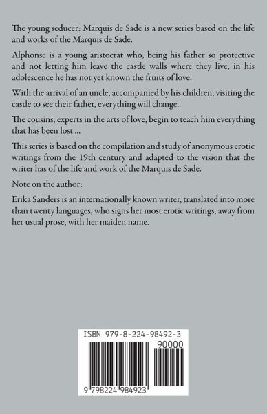 The young seducer: Marquis de Sade is a new series based on the life and works of the Marquis de Sade. Alphonse is a young aristocrat who, being his father so protective and not letting him leave the castle walls where they live, in his adolescence he has not yet known the fruits of love. With the arrival of an uncle, accompanied by his children, visiting the castle to see their father, everything will change. The cousins, experts in the arts of love, begin to teach him everything that has been lost ... This series is based on the compilation and study of anonymous erotic writings from the 19th century and adapted to the vision that the writer has of the life and work of the Marquis de Sade. Note on the author: Erika Sanders is an internationally known writer, translated into more than twenty languages, who signs her most erotic writings, away from her usual prose, with her maiden name.