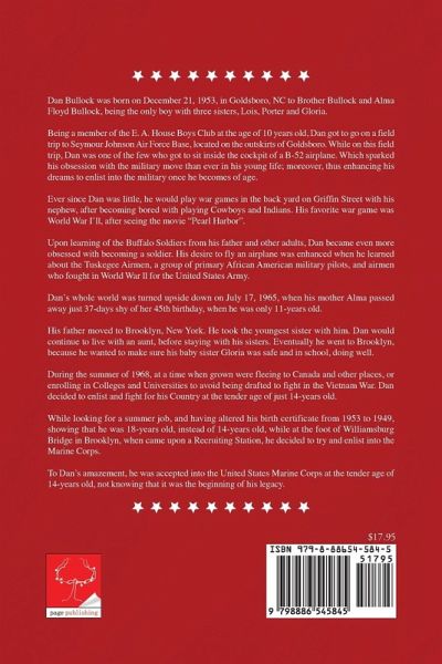 Dan Bullock was born on December 21, 1953, in Goldsboro, NC to Brother Bullock and Alma Floyd Bullock, being the only boy with three sisters, Lois, Porter and Gloria. Being a member of the E. A. House Boys Club at the age of 10 years old, Dan got to go on a field trip to Seymour Johnson Air Force Base, located on the outskirts of Goldsboro. While on this field trip, Dan was one of the few who got to sit inside the cockpit of a B-52 airplane. Which sparked his obsession with the military move than ever in his young life; moreover, thus enhancing his dreams to enlist into the military once he becomes of age. Ever since Dan was little, he would play war games in the back yard on Griffin Street with his nephew, after becoming bored with playing Cowboys and Indians. His favorite war game was World War II. Upon learning of the Buffalo Soldiers from his father and other adults, Dan became even more obsessed with becoming a soldier. His desire to fly an airplane was enhanced when he learned about the Tuskegee Airmen, a group of primary African American military pilots, and airmen who fought in World War ll for the United States Army. Dan's whole world was turned upside down on July 17, 1965, when his mother Alma passed away just 37-days shy of her 45th birthday, when he was only 11-years old. His father moved to Brooklyn, New York. He took the youngest sister with him. Dan would continue to live with an aunt, before staying with his sisters. Eventually he went to Brooklyn, because he wanted to make sure his baby sister Gloria was safe and in school, doing well. During the summer of 1968, at a time when grown were fleeing to Canada and other places, or enrolling in Colleges and Universities to avoid being drafted to fight in the Vietnam War. Dan decided to enlist and fight for his Country at the tender age of just 14-years old. While looking for a summer job, and having altered his birth certificate from 1953 to 1949, showing that he was 18-years old, instead of 14-years old, while at the foot of Williamsburg Bridge in Brooklyn, when came upon a Recruiting Station, he decided to try and enlist into the Marine Corps. To Dan's amazement, he was accepted into the United States Marine Corps at the tender age of 14-years old, not knowing that it was the beginning of his legacy.