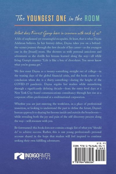 What does Forrest Gump have in common with each of us? A life of unplanned yet meaningful escapades. At least, that is what Dayna Adelman believes. In her literary debut, Dayna takes you on a behind-the-scenes journey through the first decade of her career-as the youngest one in the [board] room. She showers us with personal anecdotes and adventures as she distills her lessons learned along the way-all while living Gump's mantra: "Life is like a box of chocolates. You never know what you're gonna get." We first meet Dayna as a twenty-something straight out of college-in the waning days of the global financial crisis, and the book comes to a conclusion when she is a thirty-something-during the height of the COVID-19 pandemic. Dayna regales her readers while meandering through a significantly defining decade-from the entry-level days at a New York City-based communications consultancy through her rise as a corporate affairs professional at a multinational corporation. Whether you are just entering the workforce, in a place of professional transition, or looking to understand the past to define the future, Dayna's human approach to sharing her lessons inside and outside the boardroom-while revealing both the joy and pain of the self-discovery process along the way-will resonate with you. Be forewarned: this book does not contain a magic list of what you "should do" to achieve success. Rather, this is one young professional's personal account shared in the hope that readers will feel inspired to continue seeking their own fulfilling adventures. If you've ever wondered whether you're qualified, ready, or even in the right room-this book is for you. Join Dayna Adelman on a journey that will leave you inspired to take your own seat at the table and shape your path, one bold, imperfect step at a time.