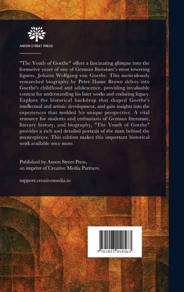 "The Youth of Goethe" offers a fascinating glimpse into the formative years of one of German literature's most towering figures, Johann Wolfgang von Goethe. This meticulously researched biography by Peter Hume Brown delves into Goethe's childhood and adolescence, providing invaluable context for understanding his later works and enduring legacy. Explore the historical backdrop that shaped Goethe's intellectual and artistic development, and gain insights into the experiences that molded his unique perspective. A vital resource for students and enthusiasts of German literature, literary history, and biography, "The Youth of Goethe" provides a rich and detailed portrait of the man behind the masterpieces. This edition makes this important historical work available once more. This work has been selected by scholars as being culturally important, and is part of the knowledge base of civilization as we know it. This work is in the public domain in the United States of America, and possibly other nations. Within the United States, you may freely copy and distribute this work, as no entity (individual or corporate) has a copyright on the body of the work. Scholars believe, and we concur, that this work is important enough to be preserved, reproduced, and made generally available to the public. We appreciate your support of the preservation process, and thank you for being an important part of keeping this knowledge alive and relevant.