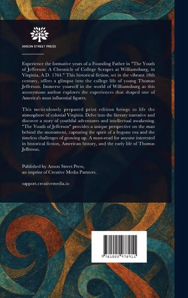 Experience the formative years of a Founding Father in "The Youth of Jefferson: A Chronicle of College Scrapes at Williamsburg, in Virginia, A.D. 1764." This historical fiction, set in the vibrant 18th century, offers a glimpse into the college life of young Thomas Jefferson. Immerse yourself in the world of Williamsburg as this anonymous author explores the experiences that shaped one of America's most influential figures. This meticulously prepared print edition brings to life the atmosphere of colonial Virginia. Delve into the literary narrative and discover a story of youthful adventures and intellectual awakening. "The Youth of Jefferson" provides a unique perspective on the man behind the monument, capturing the spirit of a bygone era and the timeless challenges of growing up. A must-read for anyone interested in historical fiction, American history, and the early life of Thomas Jefferson. This work has been selected by scholars as being culturally important, and is part of the knowledge base of civilization as we know it. This work is in the public domain in the United States of America, and possibly other nations. Within the United States, you may freely copy and distribute this work, as no entity (individual or corporate) has a copyright on the body of the work. Scholars believe, and we concur, that this work is important enough to be preserved, reproduced, and made generally available to the public. We appreciate your support of the preservation process, and thank you for being an important part of keeping this knowledge alive and relevant.