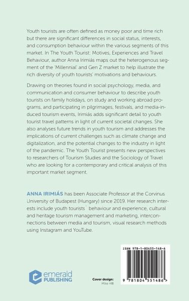 Anna Irimiás provides an informed overview on the characteristics of youth tourists with a focus on tourism consumption. Youth touristsâ pre-trip, on-stay and post-trip tourism behaviours are studied in light of the current trends. Challenges and implications are critically analysed.