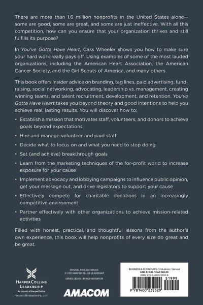There are more than 1.6 million nonprofits in the United States alone--some are good, some are great, and some are just ineffective. With all this competition, how can you ensure that your organization thrives and still fulfills its purpose? In You've Gotta Have Heart, Cass Wheeler shows you how to make sure your hard work really pays off. Using examples of some of the most lauded organizations, including the American Heart Association, the American Cancer Society, and the Girl Scouts of America, and many others. This book offers insider advice on branding, tag lines, paid advertising, fund-raising, social networking, advocating, leadership vs. management, creating winning teams, and talent recruitment, development, and retention. You've Gotta Have Heart takes you beyond theory and good intentions to help you achieve real, lasting results. You will discover how to: Establish a mission that motivates staff, volunteers, and donors to achieve goals beyond expectations Hire and manage volunteer and paid staff Decide what to focus on and what you need to stop doing Set (and achieve) breakthrough goals Learn from the marketing techniques of the for-profit world to increase exposure for your cause Implement advocacy and lobbying campaigns to influence public opinion, get your message out, and drive legislators to support your cause Effectively compete for charitable donations in an increasingly competitive environment Partner effectively with other organizations to achieve mission-related activities Filled with honest, practical, and thoughtful lessons from the author's own experience, this book will help nonprofits of every size do great and be great.