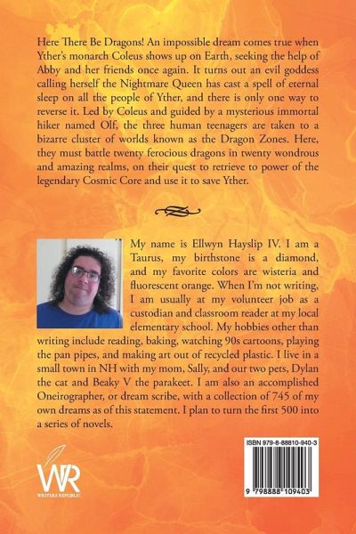 Here There Be Dragons! An impossible dream comes true when Yther's monarch Coleus shows up on Earth, seeking the help of Abby and her friends once again. It turns out an evil goddess calling herself the Nightmare Queen has cast a spell of eternal sleep on all the people of Yther, and there is only one way to reverse it. Led by Coleus and guided by a mysterious immortal hiker named Olf, the three human teenagers are taken to a bizarre cluster of worlds known as the Dragon Zones. Here, they must battle twenty ferocious dragons in twenty wondrous and amazing realms, on their quest to retrieve to power of the legendary Cosmic Core and use it to save Yther.