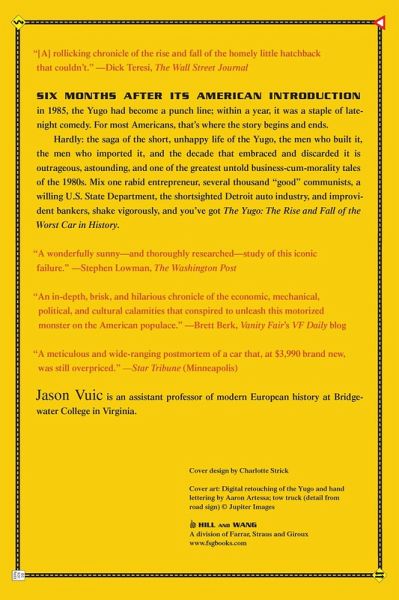 Six months after its American introduction in 1985, the Yugo was a punch line; within a year, it was a staple of late-night comedy. By 2000, NPRs Car Talk declared it the worst car of the millennium. And for most Americans thats where the story begins and ends. Hardly. The short, unhappy life of the car, the men who built it, the men who imported it, and the decade that embraced and discarded it is rollicking and astounding, and one of the greatest untold business-cum-morality tales of the 1980s. Mix one rabid entrepreneur, several thousand good communists, a willing U.S. State Department, the shortsighted Detroit auto industry, and improvident bankers, shake vigorously, and youve got The Yugo: The Rise and Fall of the Worst Car in History.