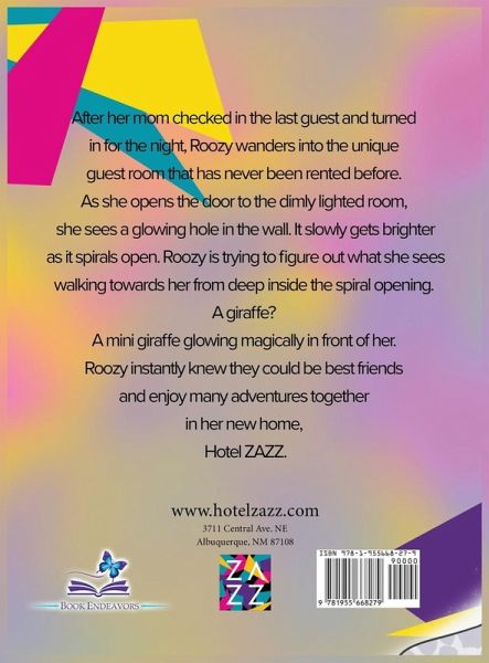 After her mom checked in the last guest and turned in for the night, Roozy wanders into the unique guest room that has never been rented before. As she opens the door to the dimly lighted room, she sees a glowing hole in the wall. It slowly gets brighter as it spirals open. Roozy is trying to figure out what she sees walking towards her from deep inside the spiral opening. A giraffe? A mini giraffe glowing magically in front of her. Roozy instantly knew that they could be best friends and enjoy many adventures together in their new home, Hotel ZAZZ.