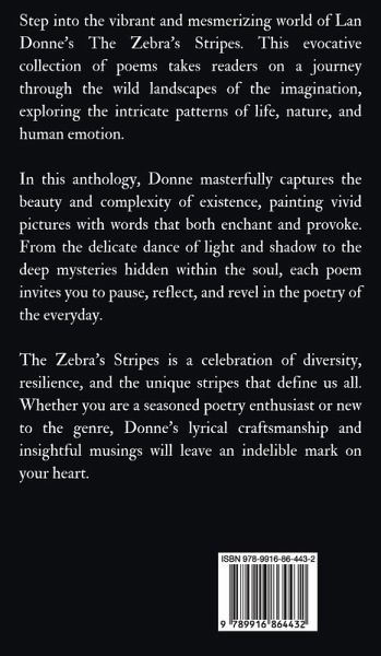 Step into the vibrant and mesmerizing world of Lan Donne's The Zebra's Stripes. This evocative collection of poems takes readers on a journey through the wild landscapes of the imagination, exploring the intricate patterns of life, nature, and human emotion. In this anthology, Donne masterfully captures the beauty and complexity of existence, painting vivid pictures with words that both enchant and provoke. From the delicate dance of light and shadow to the deep mysteries hidden within the soul, each poem invites you to pause, reflect, and revel in the poetry of the everyday. The Zebra's Stripes is a celebration of diversity, resilience, and the unique stripes that define us all. Whether you are a seasoned poetry enthusiast or new to the genre, Donne's lyrical craftsmanship and insightful musings will leave an indelible mark on your heart. Copyright (c) 2024 Swan Charm Publishing