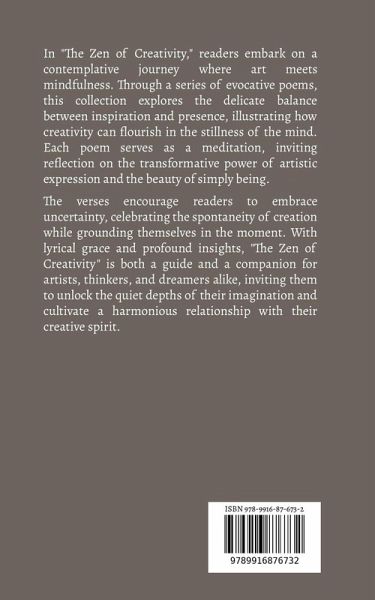 In "The Zen of Creativity," readers embark on a contemplative journey where art meets mindfulness. Through a series of evocative poems, this collection explores the delicate balance between inspiration and presence, illustrating how creativity can flourish in the stillness of the mind. Each poem serves as a meditation, inviting reflection on the transformative power of artistic expression and the beauty of simply being. The verses encourage readers to embrace uncertainty, celebrating the spontaneity of creation while grounding themselves in the moment. With lyrical grace and profound insights, "The Zen of Creativity" is both a guide and a companion for artists, thinkers, and dreamers alike, inviting them to unlock the quiet depths of their imagination and cultivate a harmonious relationship with their creative spirit.