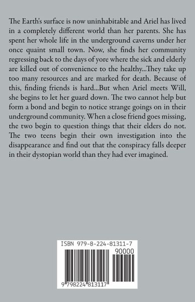The Earth's surface is now uninhabitable and Ariel has lived in a completely different world than her parents. She has spent her whole life in the underground caverns under her once quaint small town. Now, she finds her community regressing back to the days of yore where the sick and elderly are killed out of convenience to the healthy...They take up too many resources and are marked for death. Because of this, finding friends is hard...But when Ariel meets Will, she begins to let her guard down. The two cannot help but form a bond and begin to notice strange goings on in their underground community. When a close friend goes missing, the two begin to question things that their elders do not. The two teens begin their own investigation into the disappearance and find out that the conspiracy falls deeper in their dystopian world than they had ever imagined.