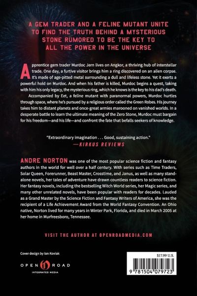 A gem trader and a feline mutant unite to find the truth behind a mysterious stone rumored to be the key to all the power in the universe. Apprentice gem trader Murdoc Jern lives on Angkor, a thriving hub of interstellar trade. One day, a furtive visitor brings him a ring discovered on an alien corpse. It’s made of age-pitted metal surrounding a dull and lifeless stone. Yet it exerts a powerful hold on Murdoc. And when his father is killed, Murdoc begins a quest, taking with him his only legacy, the mysterious ring, which he knows is the key to his dad’s death. Accompanied by Eet, a feline mutant with paranormal powers, Murdoc hurtles through space, where he’s pursued by a religious order called the Green Robes. His journey takes him to distant planets and once-great armies marooned on vanished worlds. In a desperate battle to learn the ultimate meaning of the Zero Stone, Murdoc must bargain for his freedom—and his life—and confront the fate that befalls seekers of knowledge.