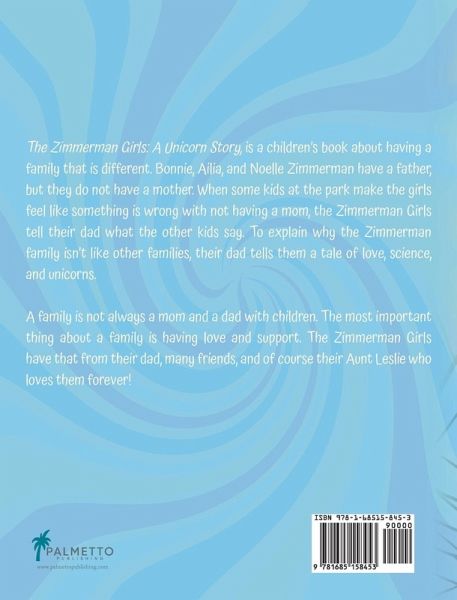 Bonnie, Ailia and Noelle are three little girls who live with their dad Marty. When another little girl at the park tells them that every family has a mommy, they begin to wonder if they are a family after all. When they ask their father why they don't have a mother, he tells them that not every family looks the same and shares the story of a magical unicorn who produced three rainbows and made his dream of fatherhood a reality. Beautifully illustrated and offering a powerful message on acceptance, The Zimmerman Girls reminds us that families take many different forms.