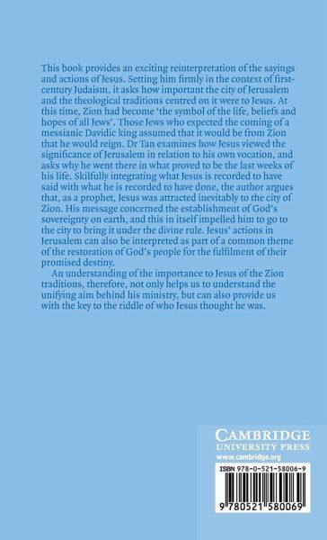 This book provides an exciting reinterpretation of the sayings and actions of Jesus. Setting him firmly in the context of first-century Judaism, it asks how important the city of Jerusalem and the theological traditions centred on it were to Jesus. At this time, Zion had become 'the symbol of the life, beliefs and hopes of all Jews'. Those Jews who expected the coming of a messianic Davidic king assumed that it would be from Zion that he would reign. Dr Tan examines how Jesus viewed the significance of Jerusalem in relation to his own vocation, and asks why he went there in what proved to be the last weeks of his life. Skillfully integrating what Jesus is recorded to have said with what he is recorded to have done, the author argues that, as a prophet, Jesus was attracted inevitably to the city of Zion. His message concerned the establishment of God's sovereignty on earth, and this in itself impelled him to go to the city to bring it under the divine rule. Jesus' actions in Jerusalem can also be interpreted as part of a common theme of the restoration of God's people for the fulfillment of their promised destiny. An understanding of the importance to Jesus of the Zion traditions, therefore, not only helps us to understand the unifying aim behind his ministry, but can also provide us with the key to the riddle of who Jesus thought he was.
