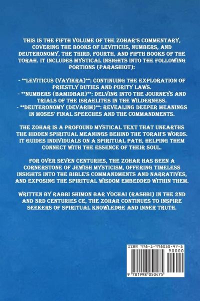 This is the fifth volume of the Zohar's commentary, covering the books of Leviticus, Numbers, and Deuteronomy, the third, fourth, and fifth books of the Torah. It includes mystical insights into the following portions (parashiot): Leviticus (Vayikra): Continuing the exploration of priestly duties and purity laws. Numbers (Bamidbar): Delving into the journeys and trials of the Israelites in the wilderness. Deuteronomy (Devarim): Revealing deeper meanings in Moses' final speeches and the commandments. The Zohar is a profound mystical text that unearths the hidden spiritual meanings behind the Torah's words. It guides individuals on a spiritual path, helping them connect with the essence of their soul. For over seven centuries, the Zohar has been a cornerstone of Jewish mysticism, offering timeless insights into the Bible's commandments and narratives, and exposing the spiritual wisdom embedded within them. Written by Rabbi Shimon Bar Yochai (Rashbi) in the 2nd and 3rd centuries CE, the Zohar continues to inspire seekers of spiritual knowledge and inner truth.