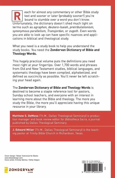 Reach for almost any commentary or other Bible study text and sooner or later (probably sooner!) you're bound to stumble over a word you don't know. Unfortunately, the dictionary doesn't shed much light on terms such as agraphon, deutero-Isaiah, pretribulationism, synonymous parallelism, Transjordan, or zugoth. Even words you are able to look up can have specific nuances and applications in biblical and theological study. What you need is a study book to help you understand the study books. You need the Zondervan Dictionary of Bible and Theology Words.This hugely practical volume puts the definitions you need most right at your fingertips. Over 1,700 words and phrases from Old and New Testament studies, biblical languages, and systematic theology have been compiled, alphabetized, and defined as succinctly as possible. You'll never be left scratching your head again. The Zondervan Dictionary of Bible and Theology Words is destined to become a staple reference tool for pastors, Sunday school teachers, and everyone with an interest in learning more about the Bible and theology. The more you study the Bible, the more you'll appreciate having this unique resource in your library.