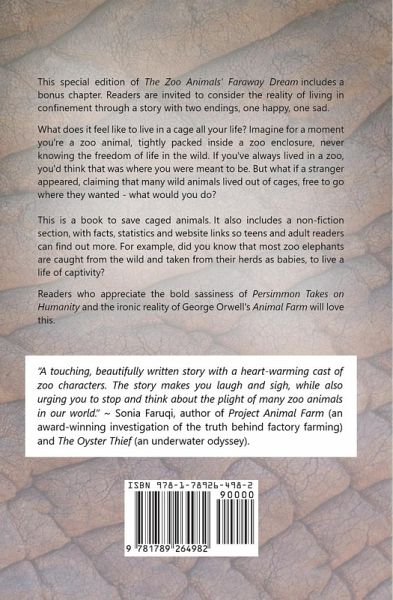 If you're into stories about zoo animals, wildlife, endangered species, nature conservation and animal welfare, you'll love both the story and facts in this animal rights fiction novel. This special edition (second edition) of The Zoo Animals' Faraway Dream includes a bonus chapter. Readers are invited to consider the reality of living in confinement through a story with two endings, one happy, one sad. What does it feel like to live in a cage all your life? Imagine, for a moment, you're a zoo animal, perhaps a mongoose, living with a horde of others, tightly packed inside a zoo enclosure, never knowing the freedom of life in the wild. If you always lived in a zoo, you'd think that was where you were meant to be. But what if a stranger appeared, claiming that many wild animals lived out of cages, free to go where they wanted to, what would you do? The Zoo Animals' Faraway Dream is a book to save caged animals. At the end of the book, there is also a non-fiction section, with facts, statistics and website links so teens and adult readers can find out more. For example, did you know that most zoo elephants are caught from the wild, and taken from their herds as babies, to live a life of captivity? Readers who appreciate the bold sassiness of Persimmon Takes on Humanity and the ironic reality of George Orwell's Animal Farm will love this. "A touching, beautifully written story with a heart-warming cast of zoo characters. The story makes you laugh and sigh, while also urging you to stop and think about the plight of many zoo animals in our world." ~ Sonia Faruqi, author of Project Animal Farm (an award-winning investigation of the truth behind factory farming) and The Oyster Thief (an underwater odyssey).