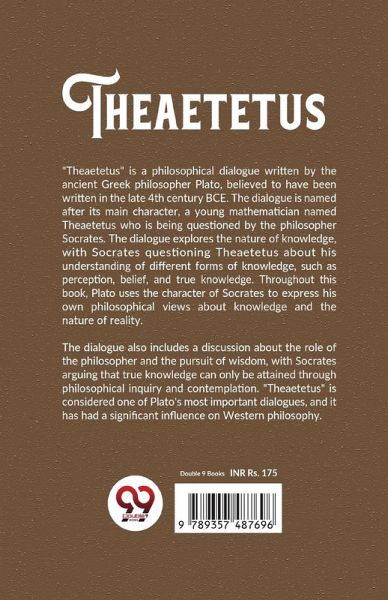 "Theaetetus" is a philosophical dialogue written by the ancient Greek philosopher Plato, believed to have been written in the late 4th century BCE. The dialogue is named after its main character, a young mathematician named Theaetetus who is being questioned by the philosopher Socrates. The dialogue explores the nature of knowledge, with Socrates questioning Theaetetus about his understanding of different forms of knowledge, such as perception, belief, and true knowledge. Throughout this book, Plato uses the character of Socrates to express his own philosophical views about knowledge and the nature of reality. The dialogue also includes a discussion about the role of the philosopher and the pursuit of wisdom, with Socrates arguing that true knowledge can only be attained through philosophical inquiry and contemplation. "Theaetetus" is considered one of Plato's most important dialogues, and it has had a significant influence on Western philosophy.