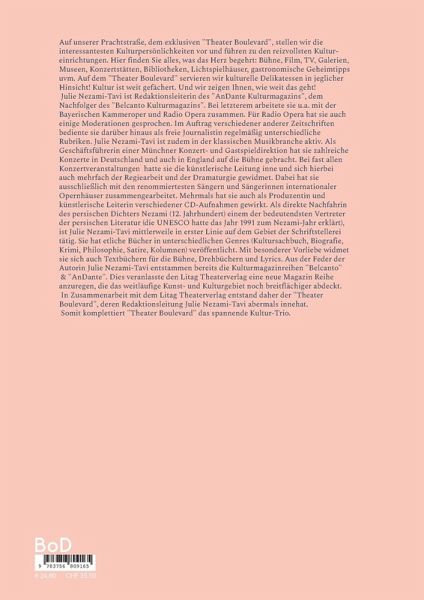 Auf unserer Prachtstraße, dem exklusiven "Theater Boulevard", stellen wir die interessantesten Kulturpersönlichkeiten vor und führen zu den reizvollsten Kultureinrichtungen. Hier finden Sie alles, was das Herz begehrt: Bühne, Film, TV, Galerien, Museen, Konzertstätten, Bibliotheken, Lichtspielhäuser, gastronomische Geheimtipps uvm. Auf dem "Theater Boulevard" servieren wir kulturelle Delikatessen in jeglicher Hinsicht! Kultur ist weit gefächert. Und wir zeigen Ihnen, wie weit das geht! Julie Nezami-Tavi ist Redaktionsleiterin des "AnDante Kulturmagazins", dem Nachfolger des "Belcanto Kulturmagazins". Bei letzterem arbeitete sie u.a. mit der Bayerischen Kammeroper und Radio Opera zusammen. Für Radio Opera hat sie auch einige Moderationen gesprochen. Im Auftrag verschiedener anderer Zeitschriften bediente sie darüber hinaus als freie Journalistin regelmäßig unterschiedliche Rubriken. Julie Nezami-Tavi ist zudem in der klassischen Musikbranche aktiv. Als Geschäftsführerin einer Münchner Konzert- und Gastspieldirektion hat sie zahlreiche Konzerte in Deutschland und auch in England auf die Bühne gebracht. Bei fast allen Konzertveranstaltungen hatte sie die künstlerische Leitung inne und sich hierbei auch mehrfach der Regiearbeit und der Dramaturgie gewidmet. Dabei hat sie ausschließlich mit den renommiertesten Sängern und Sängerinnen internationaler Opernhäuser zusammengearbeitet. Mehrmals hat sie auch als Produzentin und künstlerische Leiterin verschiedener CD-Aufnahmen gewirkt. Als direkte Nachfahrin des persischen Dichters Nezami (12. Jahrhundert) einem der bedeutendsten Vertreter der persischen Literatur (die UNESCO hatte das Jahr 1991 zum Nezami-Jahr erklärt), ist Julie Nezami-Tavi mittlerweile in erster Linie auf dem Gebiet der Schriftstellerei tätig. Sie hat etliche Bücher in unterschiedlichen Genres (Kultursachbuch, Biografie, Krimi, Philosophie, Satire, Kolumnen) veröffentlicht. Mit besonderer Vorliebe widmet sie sich auch Textbüchern für die Bühne, Drehbüchern und Lyrics. Aus der Feder der Autorin Julie Nezami-Tavi entstammten bereits die Kulturmagazinreihen "Belcanto" & "AnDante". Dies veranlasste den Litag Theaterverlag eine neue Magazin Reihe anzuregen, die das weitläufige Kunst- und Kulturgebiet noch breitflächiger abdeckt. In Zusammenarbeit mit dem Litag Theaterverlag entstand daher der "Theater Boulevard", deren Redaktionsleitung Julie Nezami-Tavi abermals innehat. Somit komplettiert "Theater Boulevard" das spannende Kultur-Trio.