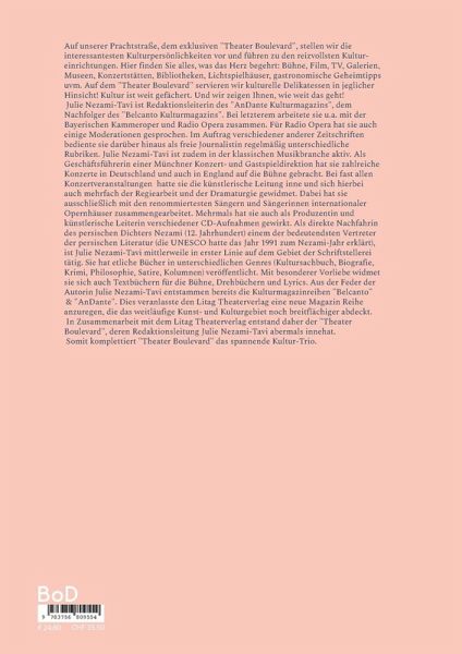 Auf unserer Prachtstraße, dem exklusiven "Theater Boulevard", stellen wir die interessantesten Kulturpersönlichkeiten vor und führen zu den reizvollsten Kultureinrichtungen. Hier finden Sie alles, was das Herz begehrt: Bühne, Film, TV, Galerien, Museen, Konzertstätten, Bibliotheken, Lichtspielhäuser, gastronomische Geheimtipps uvm. Auf dem "Theater Boulevard" servieren wir kulturelle Delikatessen in jeglicher Hinsicht! Kultur ist weit gefächert. Und wir zeigen Ihnen, wie weit das geht! Julie Nezami-Tavi ist Redaktionsleiterin des "AnDante Kulturmagazins", dem Nachfolger des "Belcanto Kulturmagazins". Bei letzterem arbeitete sie u.a. mit der Bayerischen Kammeroper und Radio Opera zusammen. Für Radio Opera hat sie auch einige Moderationen gesprochen. Im Auftrag verschiedener anderer Zeitschriften bediente sie darüber hinaus als freie Journalistin regelmäßig unterschiedliche Rubriken. Julie Nezami-Tavi ist zudem in der klassischen Musikbranche aktiv. Als Geschäftsführerin einer Münchner Konzert- und Gastspieldirektion hat sie zahlreiche Konzerte in Deutschland und auch in England auf die Bühne gebracht. Bei fast allen Konzertveranstaltungen hatte sie die künstlerische Leitung inne und sich hierbei auch mehrfach der Regiearbeit und der Dramaturgie gewidmet. Dabei hat sie ausschließlich mit den renommiertesten Sängern und Sängerinnen internationaler Opernhäuser zusammengearbeitet. Mehrmals hat sie auch als Produzentin und künstlerische Leiterin verschiedener CD-Aufnahmen gewirkt. Als direkte Nachfahrin des persischen Dichters Nezami (12. Jahrhundert) einem der bedeutendsten Vertreter der persischen Literatur (die UNESCO hatte das Jahr 1991 zum Nezami-Jahr erklärt), ist Julie Nezami-Tavi mittlerweile in erster Linie auf dem Gebiet der Schriftstellerei tätig. Sie hat etliche Bücher in unterschiedlichen Genres (Kultursachbuch, Biografie, Krimi, Philosophie, Satire, Kolumnen) veröffentlicht. Mit besonderer Vorliebe widmet sie sich auch Textbüchern für die Bühne,Drehbüchern und Lyrics. Aus der Feder der Autorin Julie Nezami-Tavi entstammten bereits die Kulturmagazinreihen "Belcanto" & "AnDante". Dies veranlasste den Litag Theaterverlag eine neue Magazin Reihe anzuregen, die das weitläufige Kunst- und Kulturgebiet noch breitflächiger abdeckt. In Zusammenarbeit mit dem Litag Theaterverlag entstand daher der "Theater Boulevard", deren Redaktionsleitung Julie Nezami-Tavi abermals innehat. Somit komplettiert "Theater Boulevard" das spannende Kultur-Trio.
