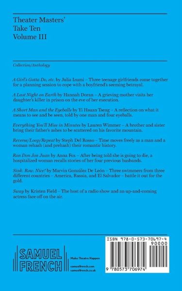 This collection includes: A Girl's Gotta Do, etc. by Julia Izumi - Three teenage girlfriends come together for a planning session to cope with a boyfriend's seeming betrayal. A Last Night on Earth by Hannah Doran - A grieving mother visits her daughter's killer in prison on the eve of her execution. A Short Man and the Eyeballs by Yi Hsuan Tseng - A reflection on what it means to see and be seen, told by one man and four eyeballs. Everything You'll Miss in Minutes by Lauren Wimmer - A brother and sister bring their father's ashes to be scattered on his favorite mountain. Reverse/Loop/Repeat by Steph Del Rosso - Time moves freely as a man and a woman rehash (and prehash) their romantic history. Ron Don Jon Juan by Anna Fox - After being told she is going to die, a hospitalized woman recalls stories of her four previous husbands. Sink. Row. Nice! by Marvin González De León - Three swimmers from three different countries - America, Russia, and El Salvador - battle it out for the gold. Sway by Kristen Field - The host of a radio show and an up-and-coming actress face off on the air.