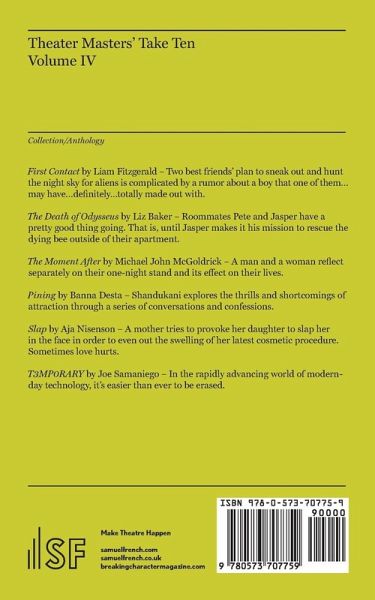 This collection includes: First Contact by Liam Fitzgerald - Two best friends' plan to sneak out and hunt the night sky for aliens is complicated by a rumor about a boy that one of them…may have…definitely…totally made out with. The Death of Odysseus by Liz Baker - Roommates Pete and Jasper have a pretty good thing going. That is, until Jasper makes it his mission to rescue the dying bee outside of their apartment. The Moment After by Michael John McGoldrick - A man and a woman reflect separately on their one-night stand and its effect on their lives. Pining by Banna Desta - Shandukani explores the thrills and shortcomings of attraction through a series of conversations and confessions. Slap by Aja Nisenson - A mother tries to provoke her daughter to slap her in the face in order to even out the swelling of her latest cosmetic procedure. Sometimes love hurts. T3MP0RARY by Joe Samaniego - In the rapidly advancing world of modern-day technology, it's easier than ever to be erased.